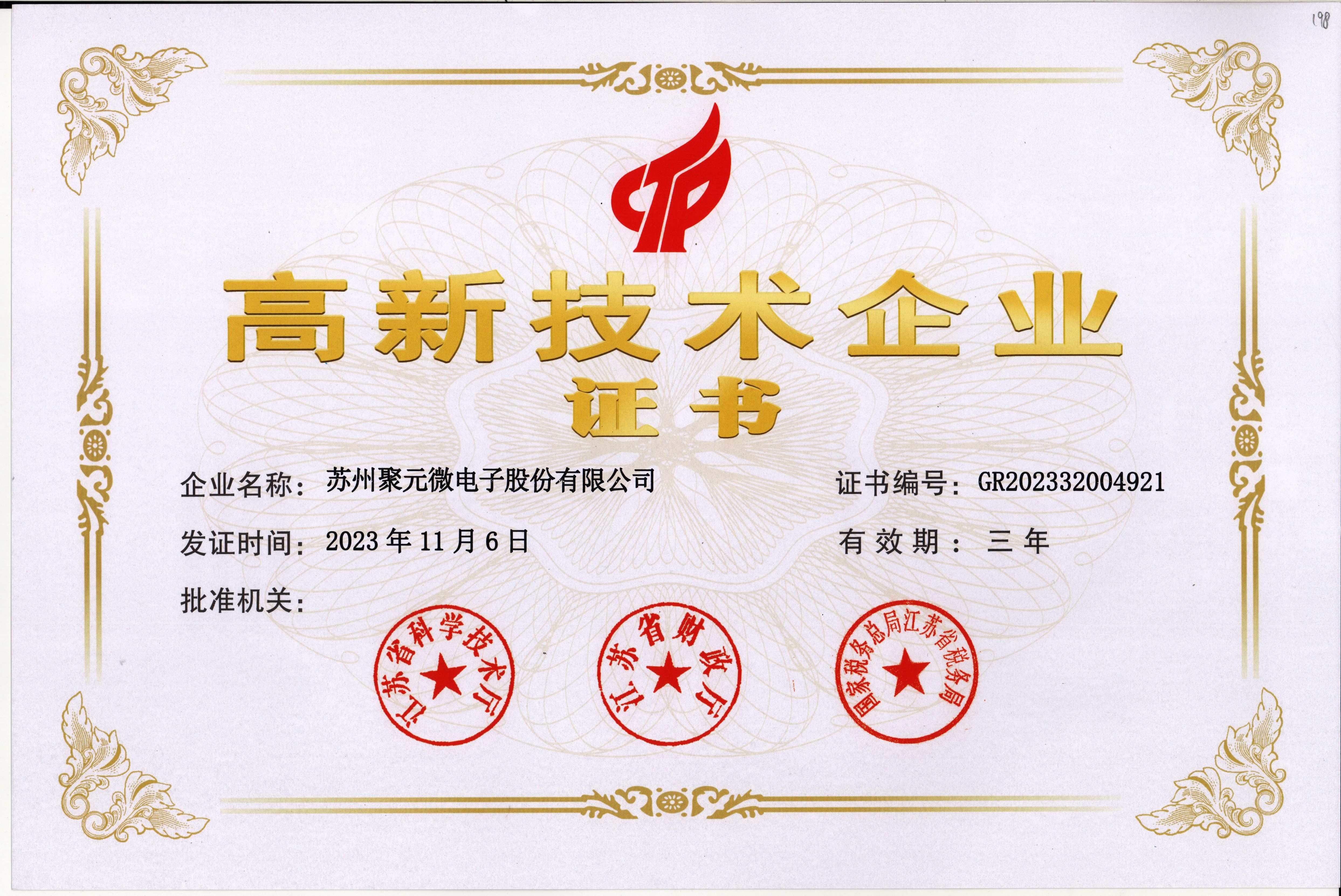 江苏省高新技术企业证书